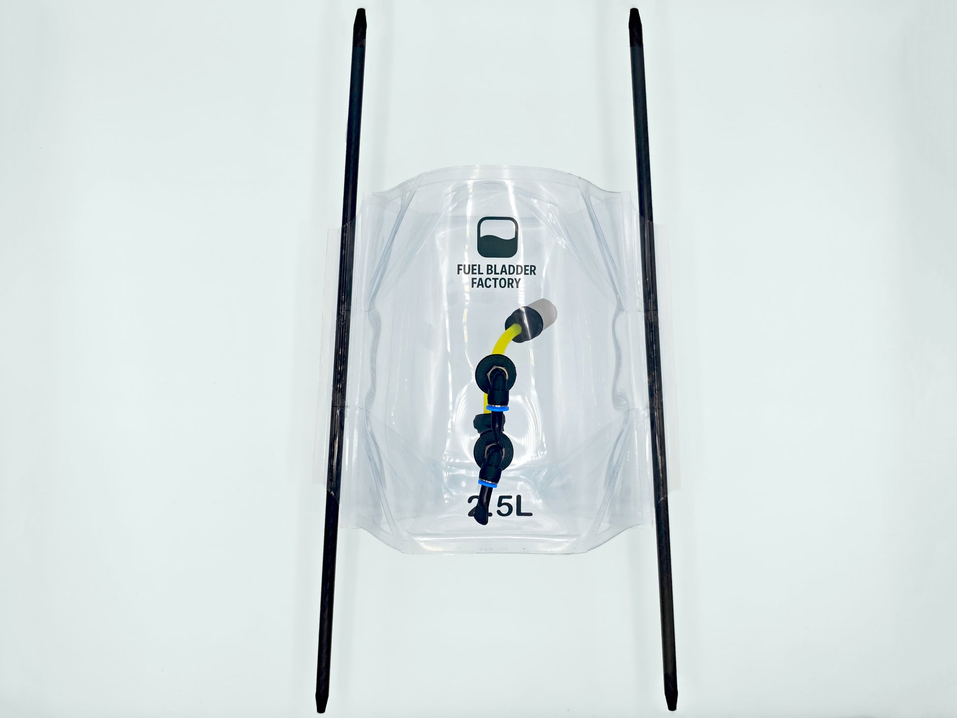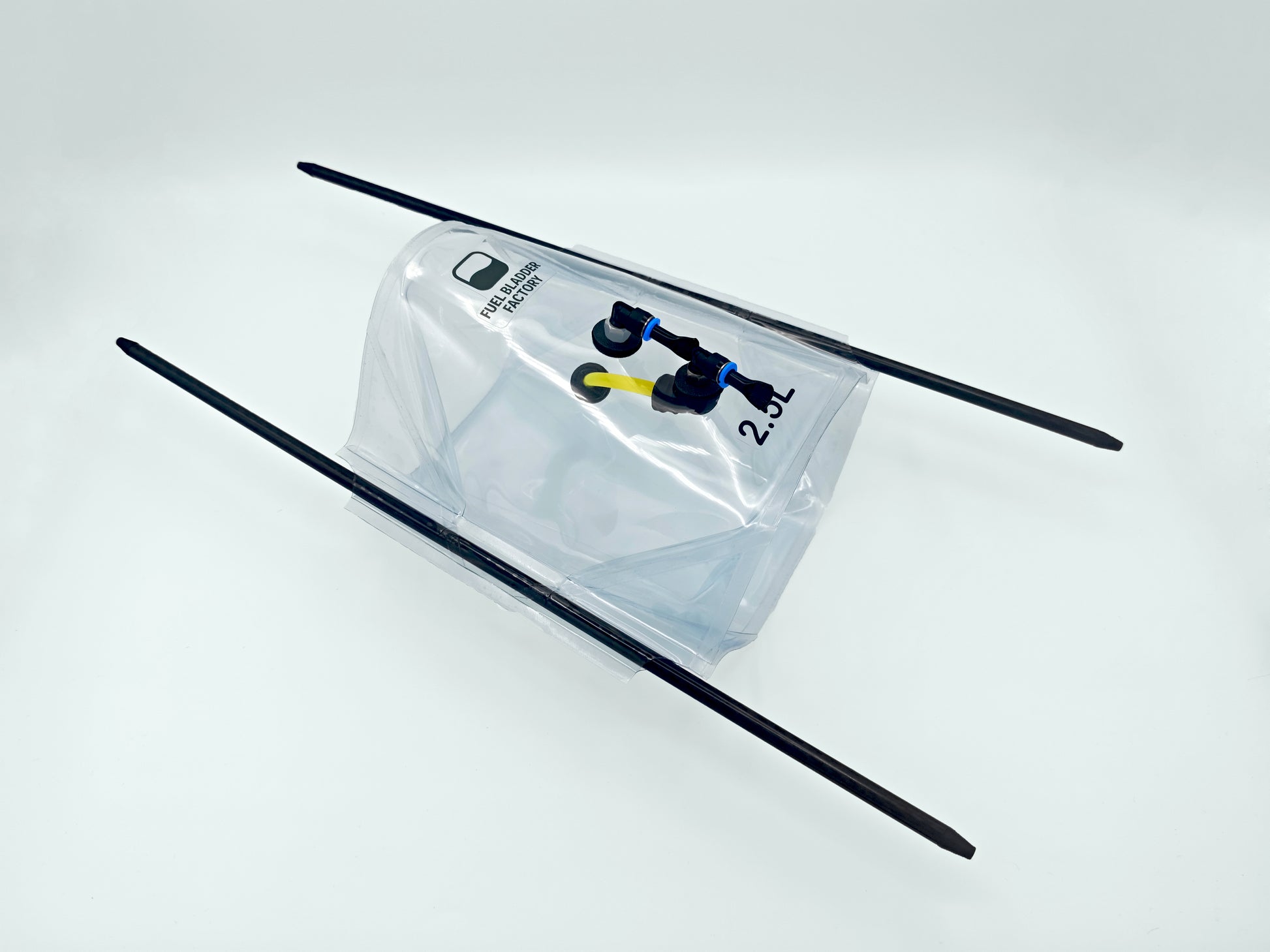 A single internal plastic layer, thicker, highly resistant, and transparent, which contains the fuel along with the intake filter. This robust layer incorporates two lateral channels designed to allow the insertion of carbon tubes for securely attaching the tank to the aircraft.